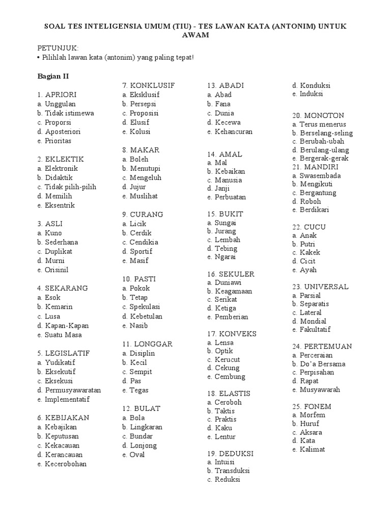 Soal Tes Inteligensia Umum Tiu Tes Lawan Kata Antonim Untuk Awam 2 Pdf